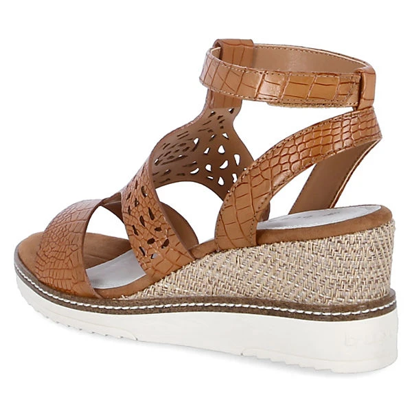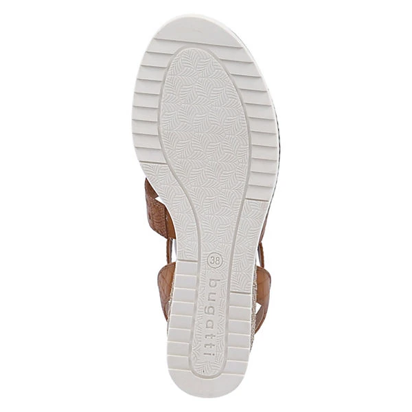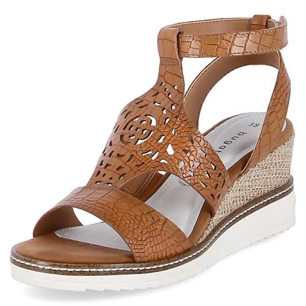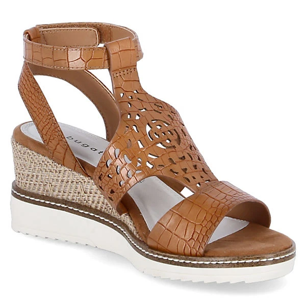 Mit den schönen Keilsandaletten ESRA EVO treten Sie immer stilvoll in Erscheinung. Die synthetischen Damenschuhe von Bugatti sind mit feinen Reptildetails, Stanzmuster und mit einem ca. 8cm hohen Absatz mit Flechtmantel um den Keileinsatz versehen. Die zeitlos, klassisch-braune Farbe harmoniert durch Bastakzente der Zwischensohle ausgezeichnet mit der eher modern, sportlich gehaltenen weißen Laufsohle. Der T-Steg fässt einen ebenfals in Reptilmuster gehaltenen Klettriemen, der wiederum am Fersenriemen halt findet.