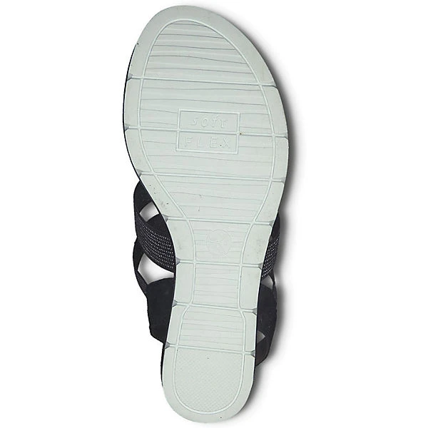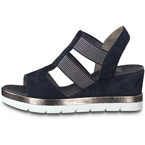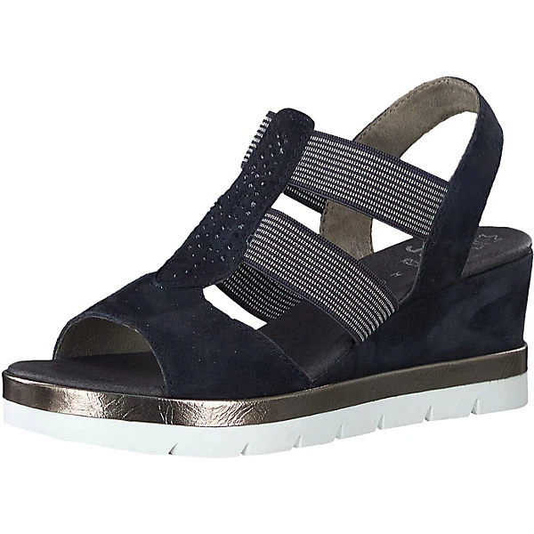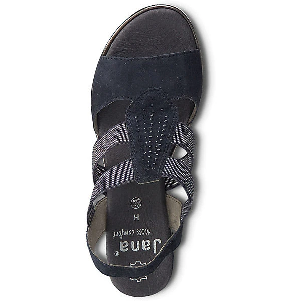 Mit modischem Keilabsatz und applizierten Schmucksteinchen zeigen sich diese klassischen Sandaletten von Jana. Für einen guten Sitz sorgen die elastischen Riemen.