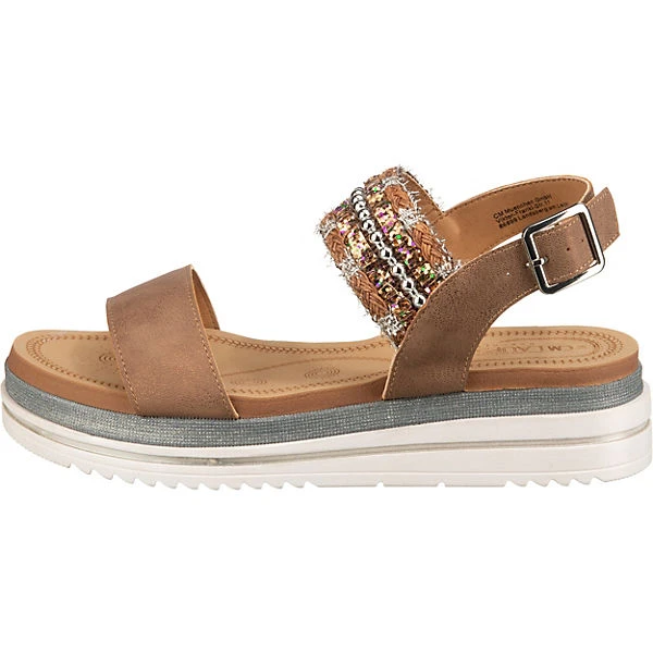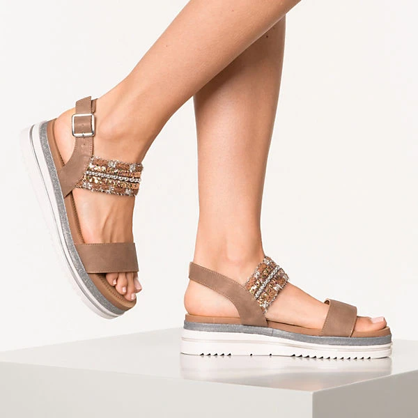 – Sandale von der Marke Laufsteg in der Farbe Cognac – Verzierung mit Glitzersteinchen – toller Schuh für den Sommer und braun gebräunte Haut – Plateausohle