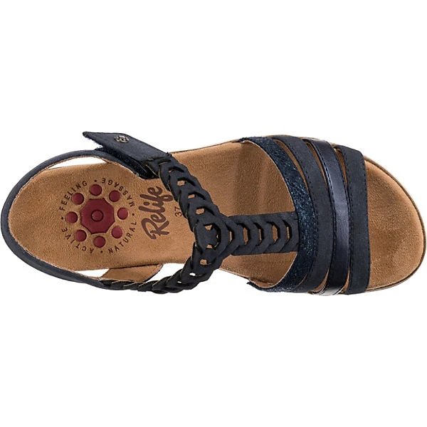 Die Sandaletten aus dem Hause Relife sorgen stets für einen schicken Auftritt. Der Keilabsatz in dezenter Höhe bietet ein angenehmes Tragegefühl und einen stilsicheren Touch. Der Klettverschluss bewirkt eine optimale Anpassung an den Fuß und einen sicheren Sitz. Der funktionale Materialmix aus Synthetik und Textil im Obermaterial unterstützt die Gestaltung dieses Schuhpaares.