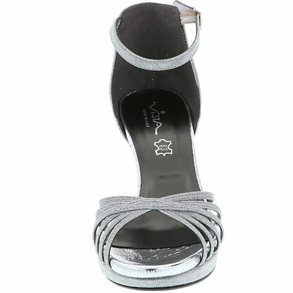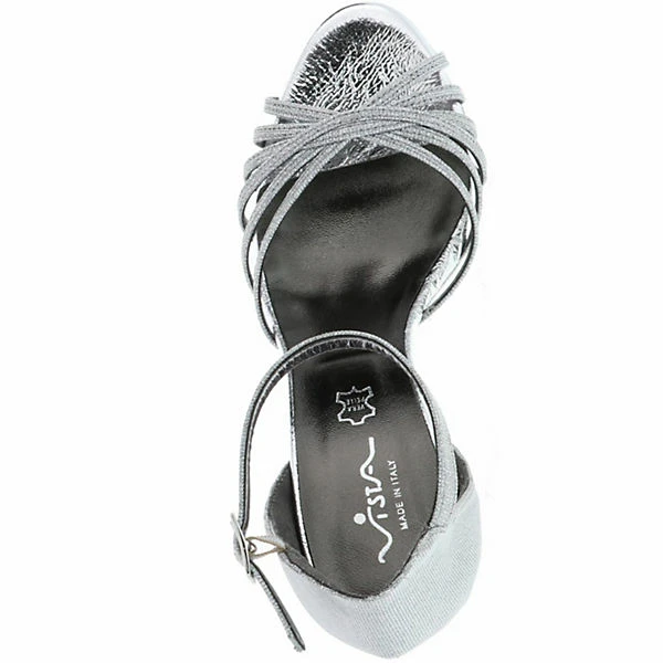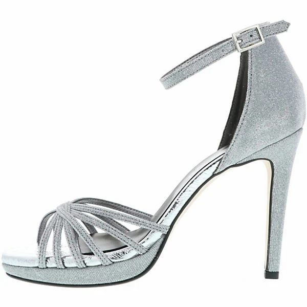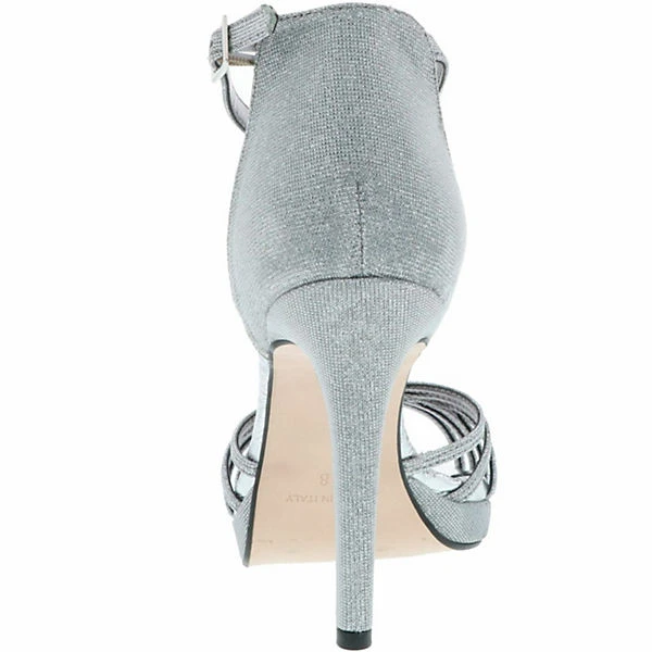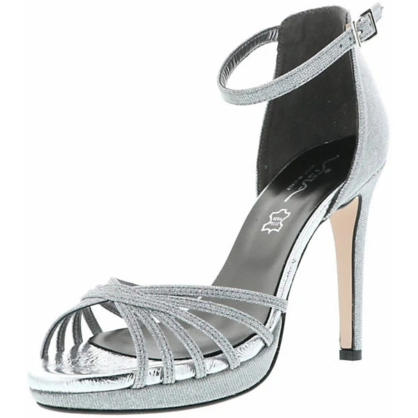 Ein schmaler Ankle-Riemen mit Schließe sorgt für einen sicheren Halt und für das gewisse Extra der Optik. Der 10 cm hohe Stilettoabsatz rundet das weibliche Design genauso ab, wie die silberne Glitzeroptik und sorgt somit für einen edlen Auftritt. Ein angenehmes Tragegefühl wird durch die Lederdecksohle garantiert.